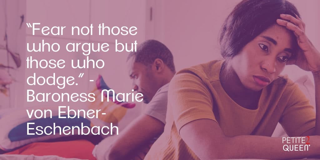 Czech novelist Baroness Marie von Ebner-Eschenbach wrote in 1905, “Fear not those who argue but those who dodge.” People who argue their positions are not the ones you should be concerned about; rather, it’s those who avoid arguments altogether that will tank a relationship.