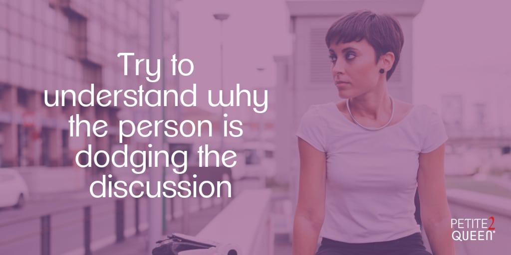Once you’ve realized that you have an argument dodger who is avoiding a discussion, you’ll need to decide what to do about it. If it’s a person with whom you don’t interact much, then you can probably just let them dodge the dialogue. Your energy is too precious to spend on a low priority.