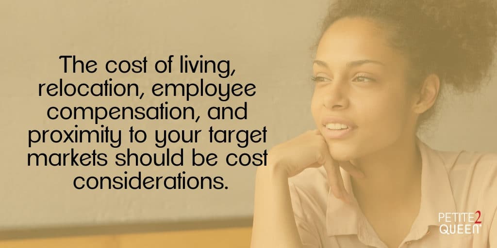 Martha, this is a complex question and deserves a comprehensive guide for consideration. However, I will touch on key components to review. The number one factor is the fit for your business. Does the city have the infrastructure, workforce, and services your business will need? Is it friendly to female entrepreneurs? What are the cost implications associated with the candidate cities?
