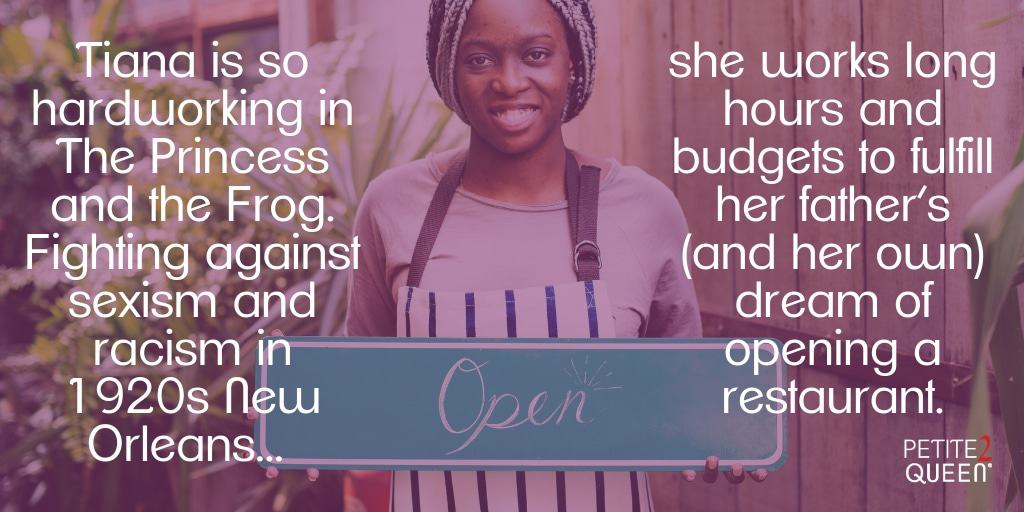 I’ve only seen The Princess and the Frog once, but I was struck by how hardworking Tiana is. Fighting against sexism and racism in 1920s New Orleans, she works long hours and budgets to fulfill her father’s (and her own) dream of opening a restaurant. Pragmatic and grounded, she’s unlike any other fairytale princess I’ve seen. – Rachel